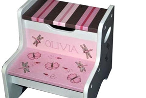This 2 step stool is designed to help toddlers reach the bathroom sink (brushing teeth and washing hands) kitchen counters (cooking with mom) and climbing into their big boy or big girl beds. This sturdy wooden 2 step stool has built in handles for easy carrying. All of our stools are painted with a great amount of detail on both steps. In addition there is coordinating detail painted on both sides. ALL STOOLS CAN BE PERSONALIZED AT NO EXTRA CHARGE. ****NO STENCILS OR STAMPS ARE USED**** A durable polyurethane finish makes it easy to clean and built in side handles make it easy to carry. All paints and finishes used are lead-free and non-toxic, and the solid hardwood construction is designed to last. Dimensions: 13" H x 13" W x 13.5" D ****THIS STOOL SHIPPED FULLY ASSEMBLED****