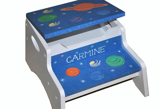 This 2 step stool is designed to help toddlers reach the bathroom sink (brushing teeth and washing hands) kitchen counters (cooking with mom) and climbing into their big boy or big girl beds. This sturdy wooden 2 step stool has built in handles for easy carrying. All of our stools are painted with a great amount of detail on both steps. In addition there is coordinating detail painted on both sides. ALL STOOLS CAN BE PERSONALIZED AT NO EXTRA CHARGE. ****NO STENCILS OR STAMPS ARE USED**** A durable polyurethane finish makes it easy to clean and built in side handles make it easy to carry. All paints and finishes used are lead-free and non-toxic, and the solid hardwood construction is designed to last. Dimensions: 13" H x 13" W x 13.5" D ****THIS STOOL SHIPPED FULLY ASSEMBLED****