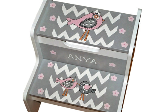This 2 step stool is designed to help toddlers reach the bathroom sink (brushing teeth and washing hands) kitchen counters (cooking with mom) and climbing into their big boy or big girl beds. This sturdy wooden 2 step stool has built in handles for easy carrying. All of our stools are painted with a great amount of detail on both steps. In addition there is coordinating detail painted on both sides. ALL STOOLS CAN BE PERSONALIZED AT NO EXTRA CHARGE. ****NO STENCILS OR STAMPS ARE USED**** A durable polyurethane finish makes it easy to clean and built in side handles make it easy to carry. All paints and finishes used are lead-free and non-toxic, and the solid hardwood construction is designed to last. Dimensions: 13" H x 13" W x 13.5" D ****THIS STOOL SHIPPED FULLY ASSEMBLED****