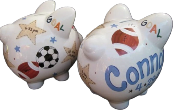 Every child needs a piggy bank! These banks make a great baby shower, birthday, or anytime gift. Piggy banks are equipped with a rubber stopper on the bottom for easy access. Comes wrapped in a cellophane bag with bow and gift card. Piggy size is approx. 8x7x6