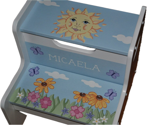 This 2 step stool is designed to help toddlers reach the bathroom sink (brushing teeth and washing hands) kitchen counters (cooking with mom) and climbing into their big boy or big girl beds. This sturdy wooden 2 step stool has built in handles for easy carrying. All of our stools are painted with a great amount of detail on both steps. In addition there is coordinating detail painted on both sides. ALL STOOLS CAN BE PERSONALIZED AT NO EXTRA CHARGE. ****NO STENCILS OR STAMPS ARE USED**** A durable polyurethane finish makes it easy to clean and built in side handles make it easy to carry. All paints and finishes used are lead-free and non-toxic, and the solid hardwood construction is designed to last. Dimensions: 13" H x 13" W x 13.5" D ****THIS STOOL SHIPPED FULLY ASSEMBLED****